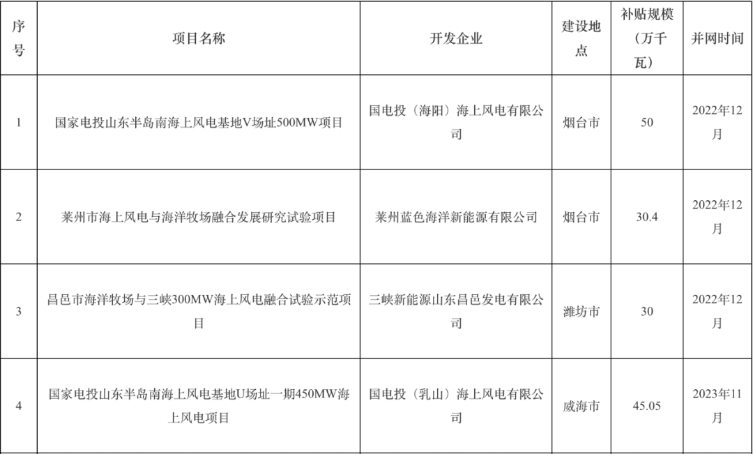 為落實《山東省人民政府關于印發2022年“穩中求進”高質量發展政策清單(第二批)的通知》(魯政發〔2022〕4號)、《山東省人民政府關于印發2023年“穩中向好、進中提質”政策清單(第一批)的通知》(魯政發〔2022〕18號)、《山東省人民政府關于印發2024年“促進經濟鞏固向好、加快綠色低碳高質量發展”政策清單(第一批)的通知》(魯政發〔2023〕13號)等部署要求,對2022—2024年建成并網的海上風電項目給予財政補貼,補貼資金分運營年度撥付到位。我局根據《山東省海上風電財政補貼資金管理辦法》(魯財建〔2024〕23號)等文件有關規定,組織對煙臺、威海、濰坊市上報的2025年度海上風電省級財政補貼資金申報材料進行了復審。經復審,煙臺、威海、濰坊市上報的9個海上風電項目補貼申報材料符合要求,現將項目基本信息及補貼規模公示如下: