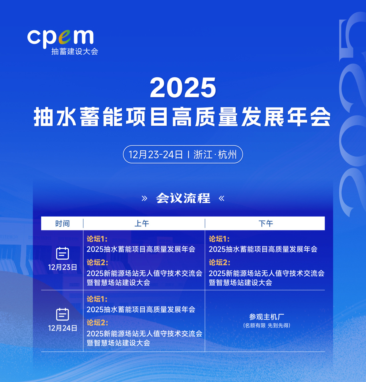 2025年12月23-24日,“2025抽水蓄能項目高質量發展年會”將在杭州市盛大召開!同期舉辦“2025 新能源智慧場站建設大會暨新能源場站無人值守技術交流會”。