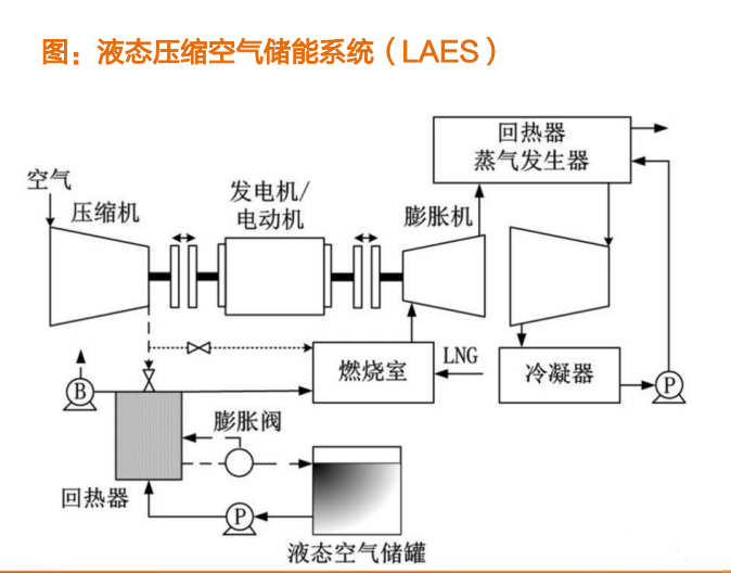 液態壓縮空氣儲能系統(LAES):借助于空氣降溫液化技術,通過添加流程使空氣以液態形式儲存。儲能時,經過壓縮機的高壓空氣進入回熱器降溫和降壓設備進行液化,被液化的常壓低溫液態空氣儲存在儲液罐中;釋能時,液態空氣經過低溫泵升壓、回熱器升溫,然后進入燃燒室,與燃料混合燃燒后進入膨脹機膨脹做功。