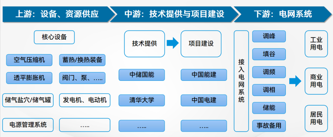 中游——技術提供與項目建設:目前國內壓縮空氣儲能的技術積累與項目建設已做到全球領先。主要的技術提供方是中科院熱物理研究所下屬的中儲國能,以及清華大學等高校。